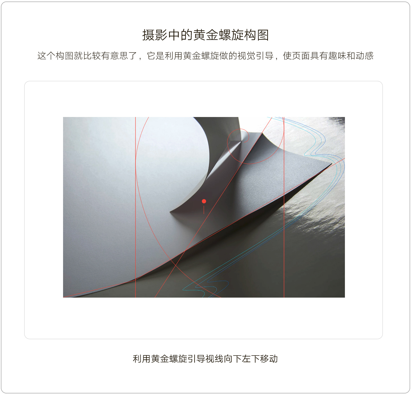 (图片来自摄影师:Carlos Caicedo)上面这张图是利用黄金螺旋的方法实现的构图。从主体(焦距偏上)慢慢渐进到客体,过渡非常的舒服自然。右侧的几条流线加强了页面的流动感,看上去要更加的动感有趣。原本以对角线构图的纸张一折叠,折线部分更是对应了这种流线的动感,几种构图方法和细节叠加在一起,让画面变得足够的和谐也同时极具美感。