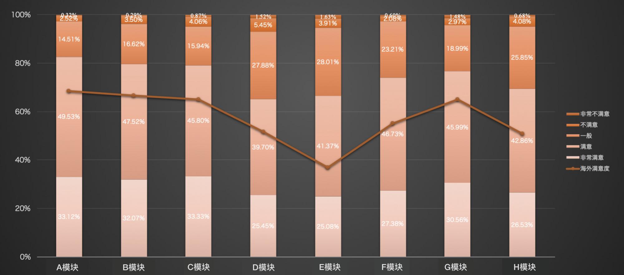 下图是某个系统的功能满意度,很明显可以看到D、E模块的满意度是低于其他模块的,后续可重点关注这2个模块;同时,海外用户的满意度普遍低于所有用户,确实在这之前海外用户的需求,比较难触达到产品组内部。