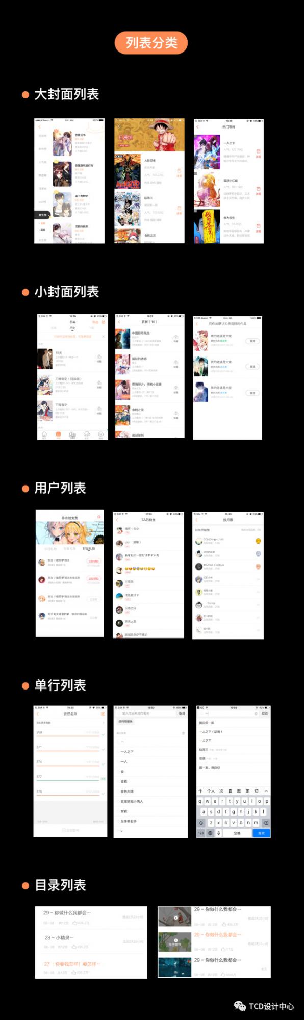 在列表中,我分为了大封面列表、小封面列表、用户列表、单行列表