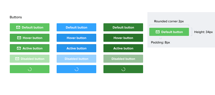 按钮是最常见的组件之一,按钮有5个状态:1.Normal 2.Hover 3.Active 4.Disabled 5.Loading。需要在规范中分别罗列出这五个状态,标注上对应的按钮填充色、边框色、圆角值、按钮宽度和高度,按钮文本大小、颜色值。如果是图标按钮的话,除了上述参数值以外还需要标注icon和按钮文本之间的间距和icon图标的大小。