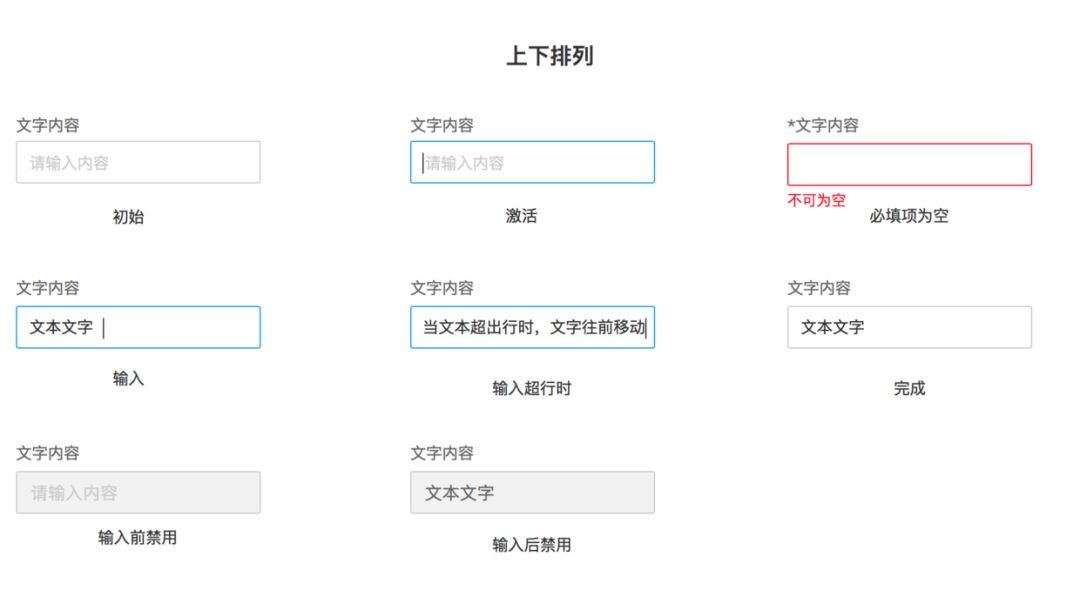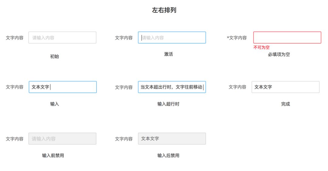 标题和输入框左右排列时,短文本组件存在的状态有:初始态、激活态、报错态、完成态和禁用态。