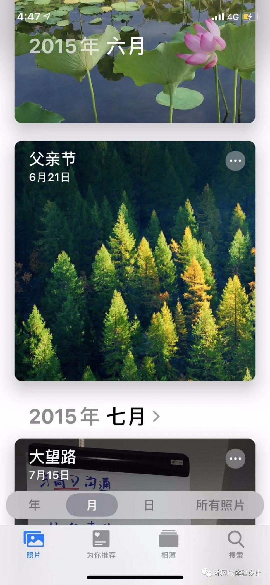这个交互操作,巧妙地解决了“相册只使用一张封面图,如何代表这个相册”的难题,可以说是神来之笔了。另外,新版照片App,在底部增加了一个操作栏,点击可以切换“年”、“月”、“日”、“所有照片”这些维度;增加了手势返回的支持:从屏幕左边缘向右滑动,可以返回上一个维度,例如现在用户位于“日”这个维度,向右滑动则可以返回到“月”这个维度。这些控件和操作的增加,对于用户在不同时间维度之间切换,还是很方便的。