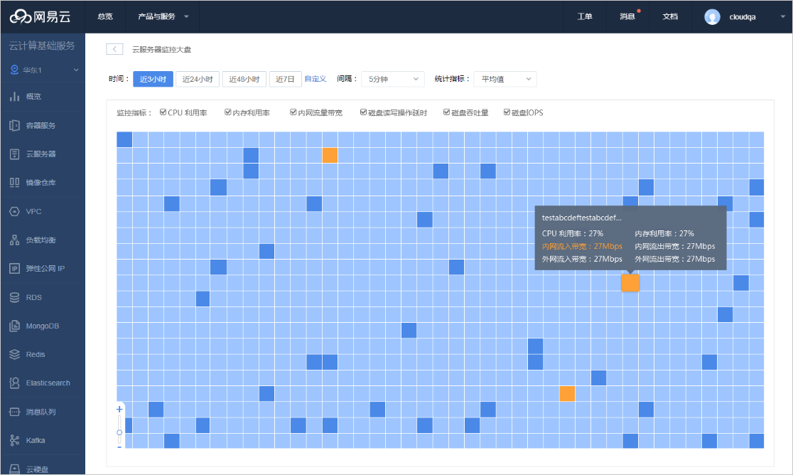 将所有的云服务器都抽象成一个个矩形,按照创建的顺序进行Z字排列,并显示在视图中。矩形的颜色代表云服务器监控指标的状况。颜色浅表示云服务器的监控指标状况正常;颜色较深的方框则表示云服务器的某个或多个监控指标相对偏高,但也属于正常状态,只是可以引起一定注意;当方块颜色显示为黄色,则表示该云服务器内有监控指标出现了异常,这个时候目标用户就需要引起重视。