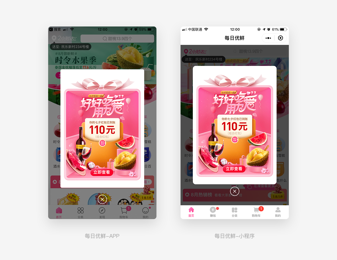 如上:每日优鲜的APP中,弹框层级最高,内容非常醒目;但是在小程序中,背景遮罩不能覆盖导航栏和标签栏,弹框的展示效果较弱。