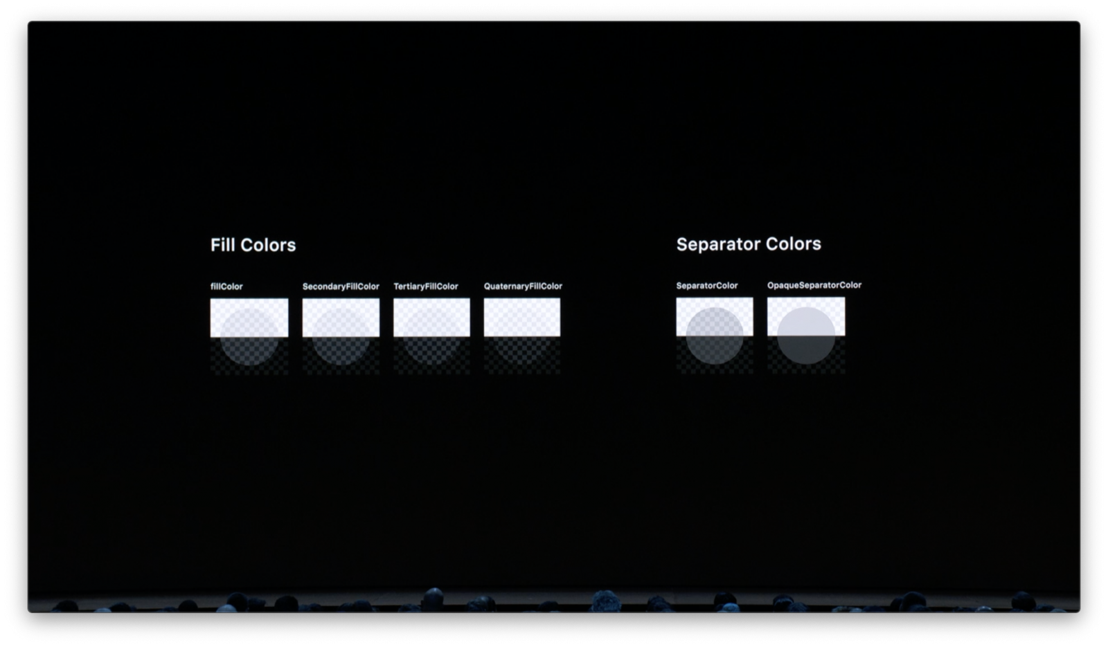 此外,系统内置的语义化颜色还包括填充色(FillColor),以及分隔线色(SeparatorColor)。其中,所有的填充色和一种分隔线色采用了半透明效果,以便与各类背景色形成良好的对比度。
