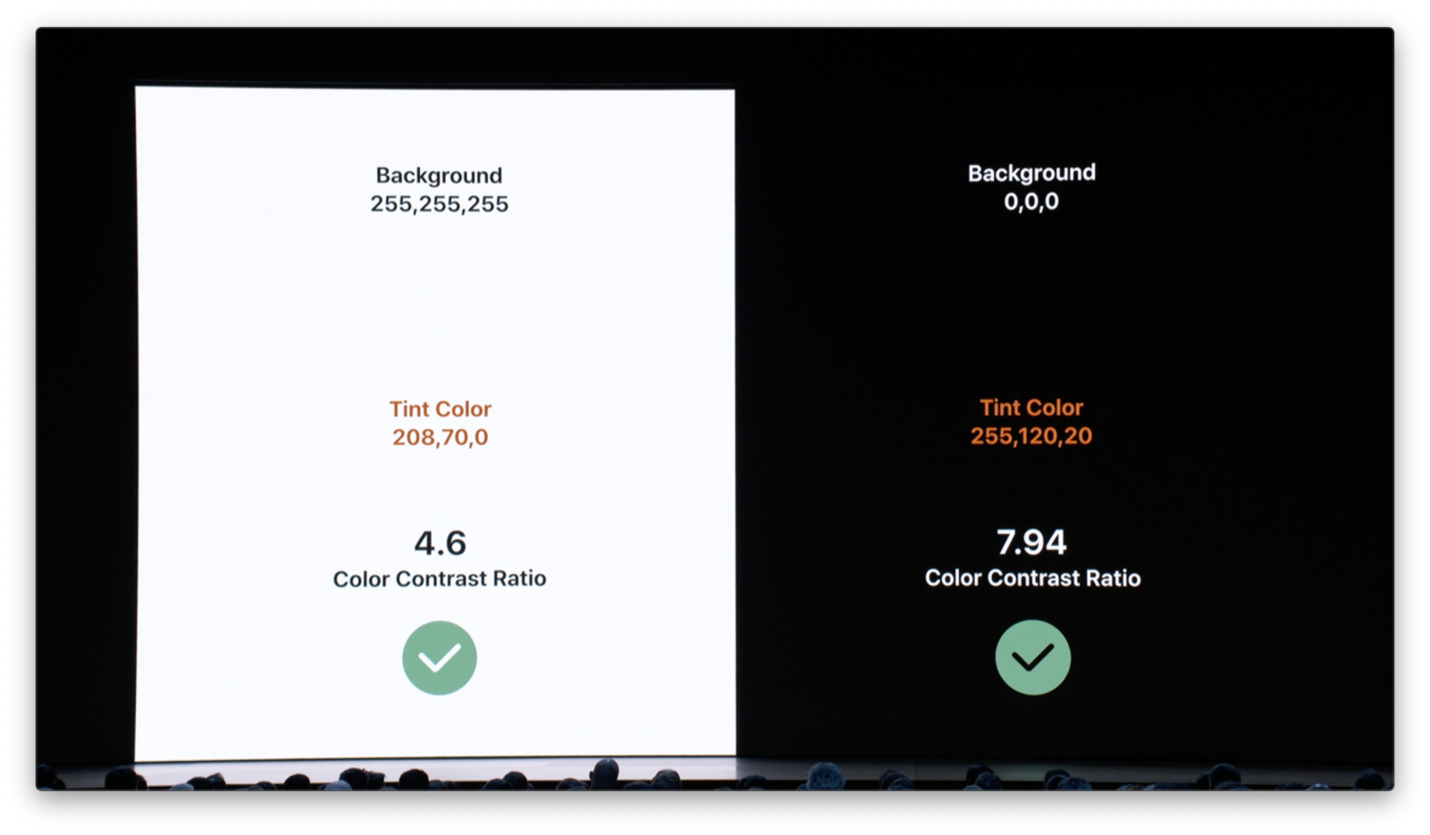 如果你需要使用定制化的着色,那么同样要确保它们可以适配于深、浅两种外观模式;在浅色模式当中表现良好的颜色,到了深色模式当中可能会产生对比度不足的问题,反之亦然。因此,最好可以通过线上的对比度计算工具来进行精准确认。