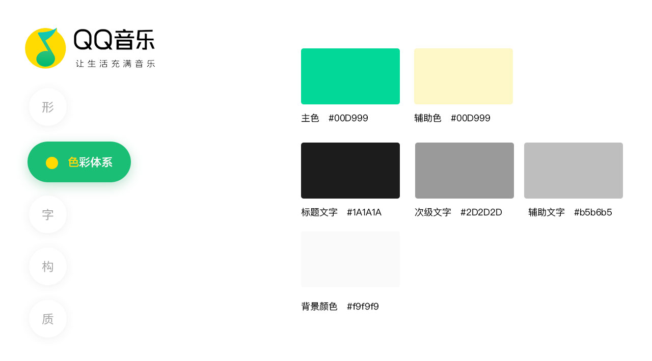 其次则是对色这一类别进行分析,颜色其实是对于品牌调性有很大的影响,比如一想起QQ音乐就知道主色是绿,一想起网易云音乐就知道主色是红,对用户的记忆点更深刻。通过截屏测量进行分析,得出整体的颜色如下(由于手机屏幕的色差原因,不可避免会有些许误差)