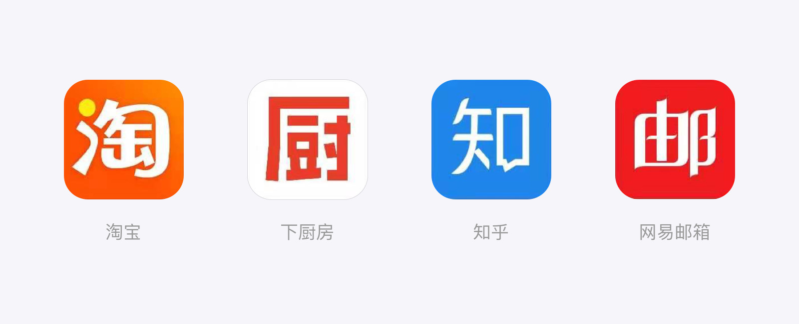 关键字提取,就是提取APP名称中关键的一个字作为元素进行设计。比如淘宝的“淘”,知乎的“知”,都是采用的最关键的一个字进行提取设计。如下图:
