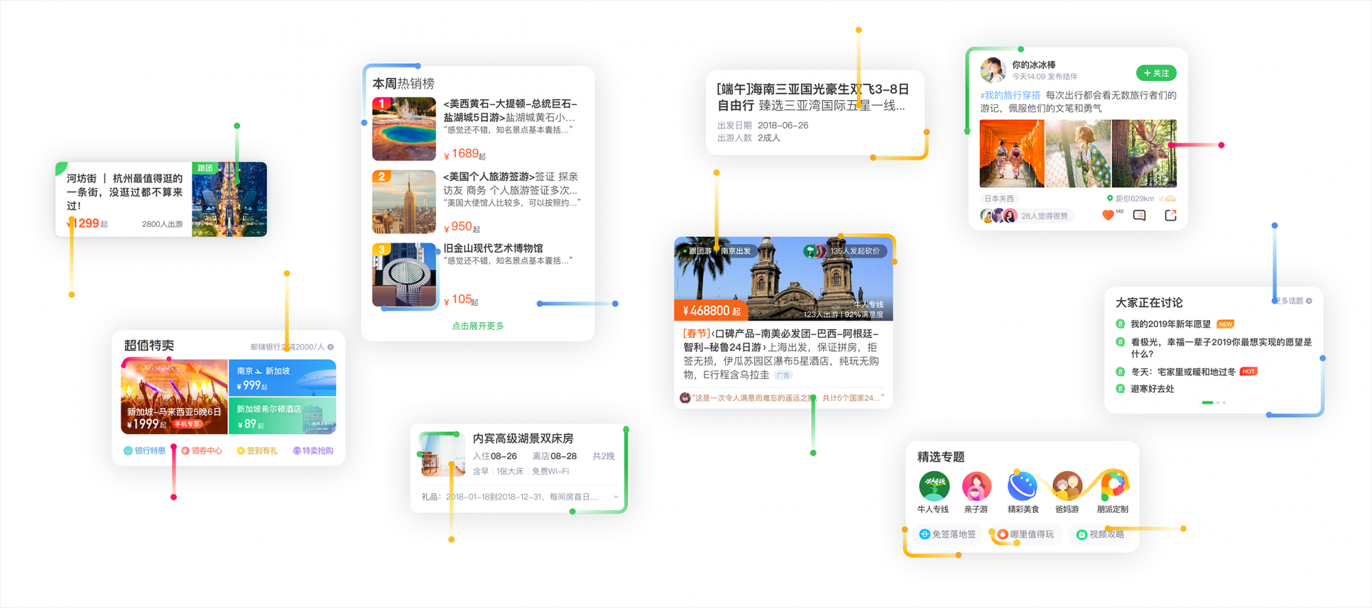 针对旅游产品、用户产出内容、组合信息等拓展的背板矩阵也将信息层级收口为视觉框架,并根据不同的业务属性灵活组装,进行容器框架内的业务自适应,真正做到了“和而不同”,丰富了产品视觉呈现形式。