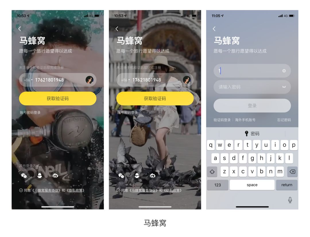 这个我们在参考的时候可能需要考虑一下公司的产品特点,以及时间和成本的投入是否是公司能够承担的(这个是很现实的问题)。其次马蜂窝还有一个小交互细节,值得注意一下,当用户开始输入账号的时候,背景的动图就会变成高斯模糊,减少用户在输入时所受到的干扰,这虽然是一个小细节,但是在我们平时设计的时候是一定要考虑到的小细节。