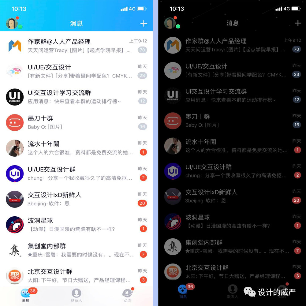 QQ对于黑暗模式的设计就更加细致一些,除了背景色、文字颜色、图片之外对底部的标签栏也有黑暗化设计,并且这种设计也不是简简单单的修改颜色,而是做了更加细节的场景化设计。