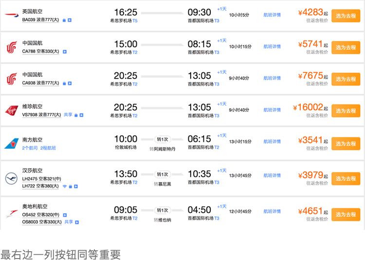 最重要按钮多数情况下只有一个,但有时也允许一个页面重复出现–它们长得一摸一样、排列整齐,例:机票酒店页的“预定”按钮: